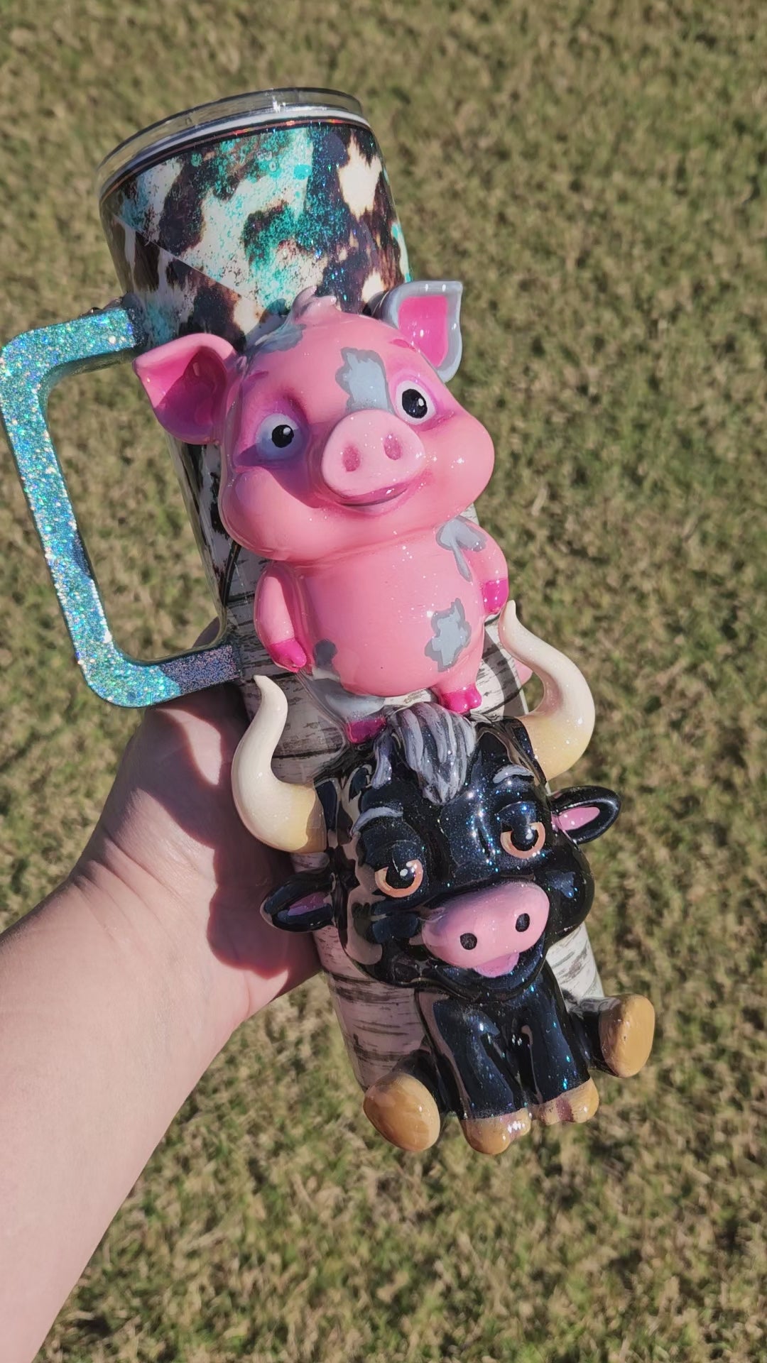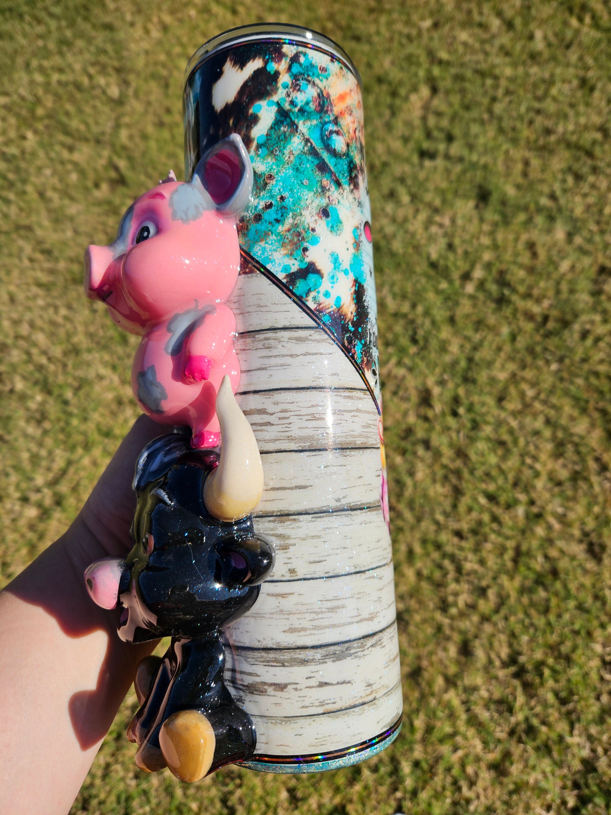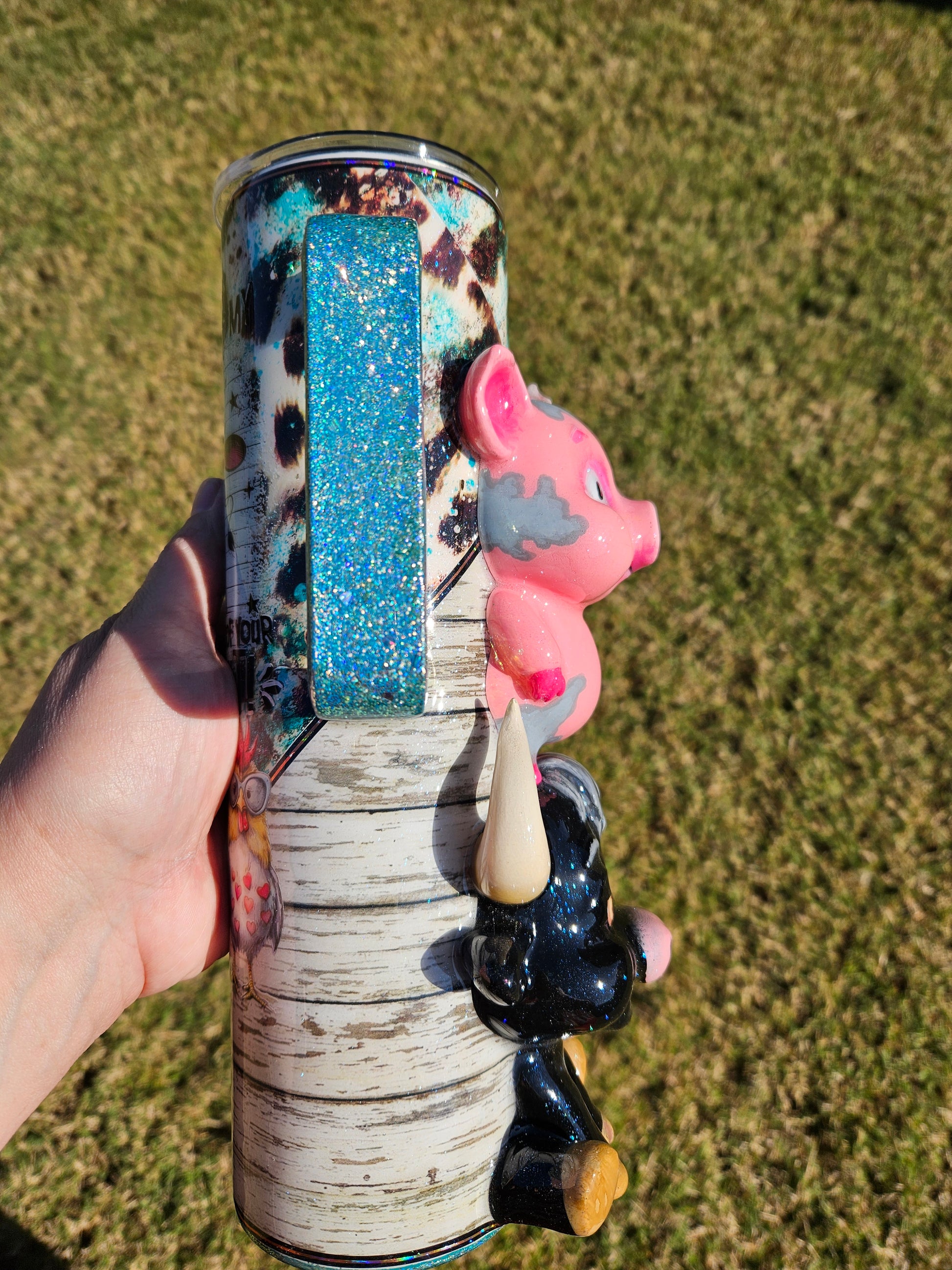 This handmade tumbler is crafted using c3D items, paint, vinyl, glitter and epoxy resin, and features a double-walled stainless steel design for durability. To preserve its quality, we recommend handwashing only. Please avoid exposing the tumbler to extreme heat or cold, as this may affect the resin. Additionally, do not soak in water to maintain its longevity.