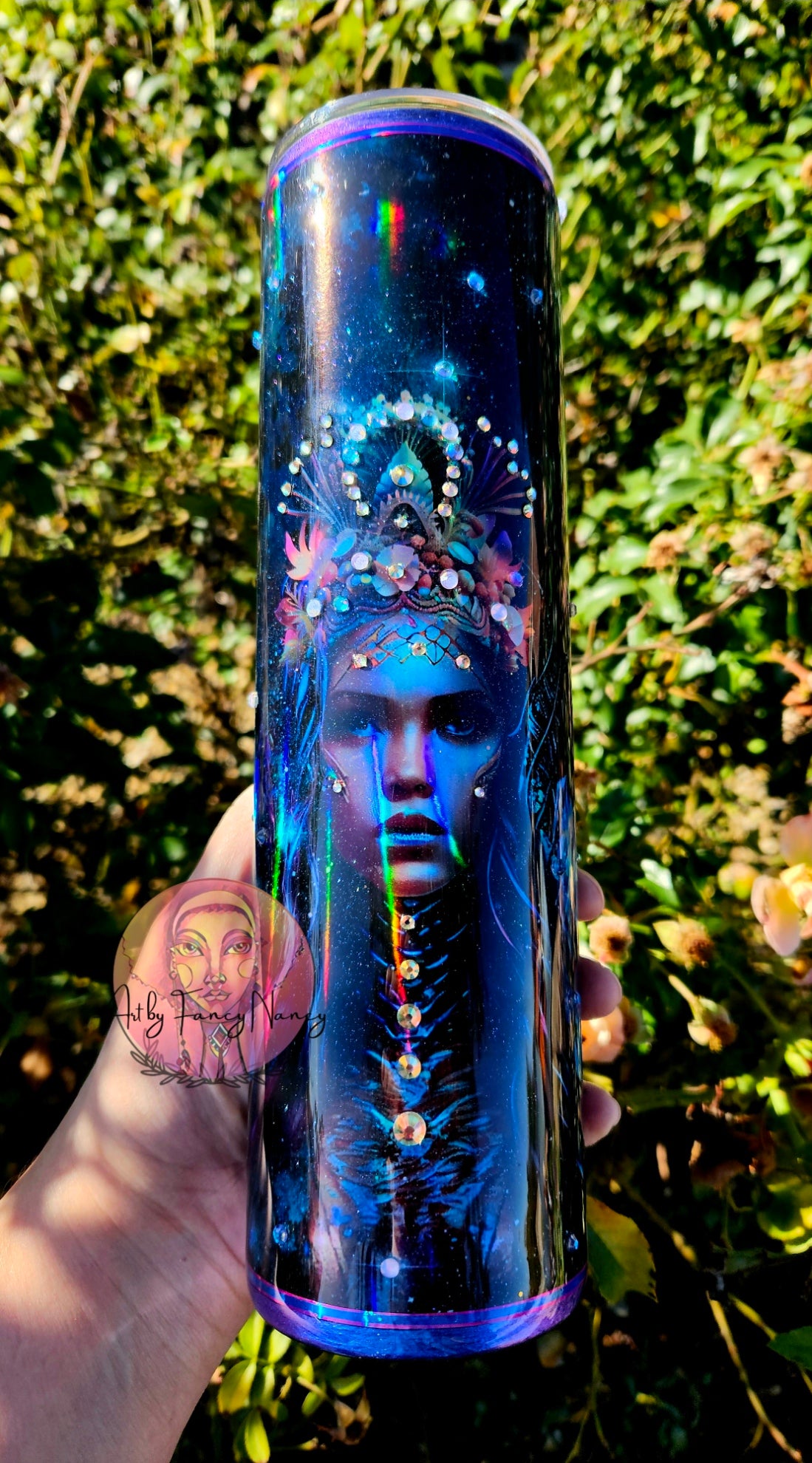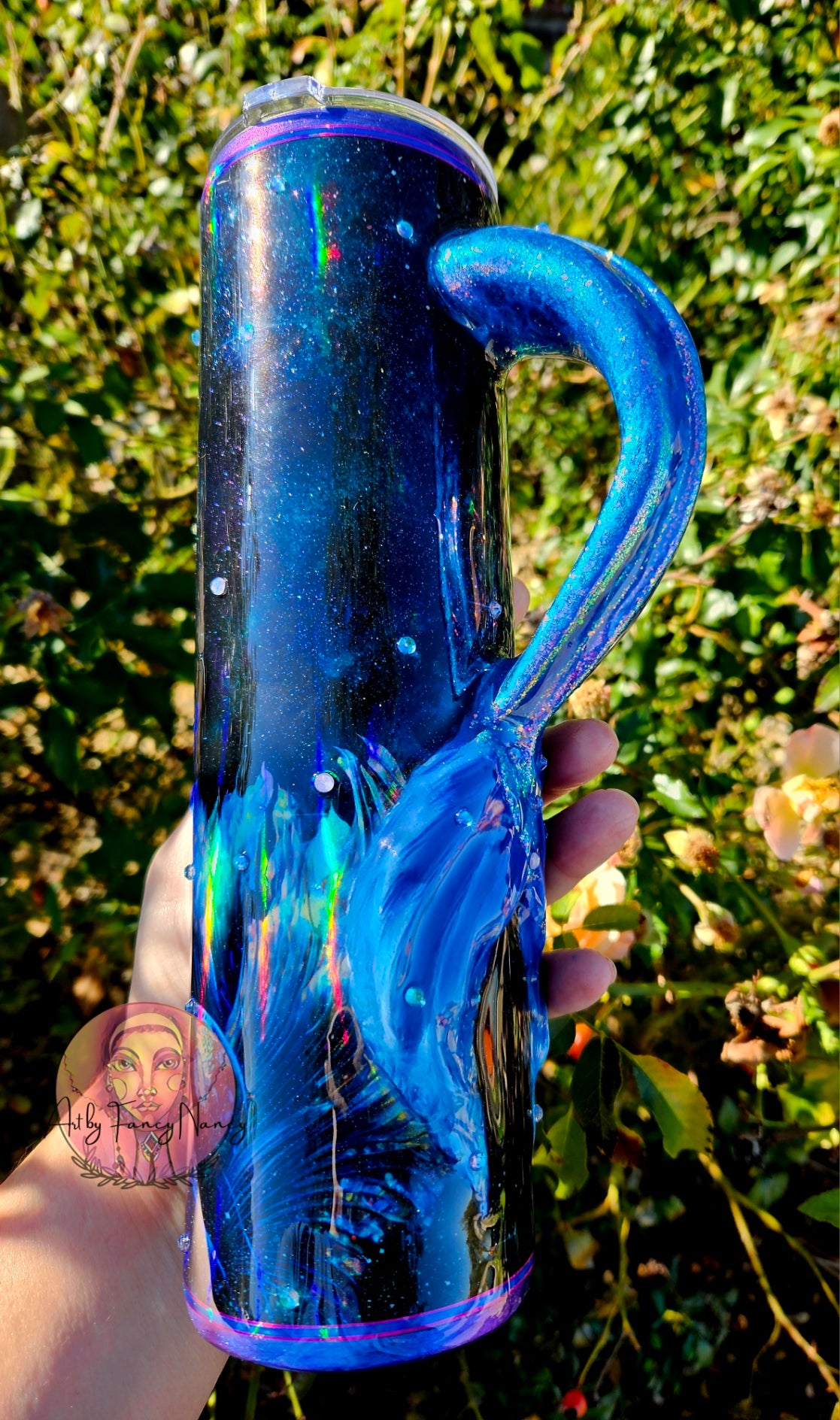 This handmade tumbler is crafted using clay, paint, vinyl, glitter, rhinestones, and epoxy resin, and features a double-walled stainless steel design for durability. To preserve its quality, we recommend handwashing only. Please avoid exposing the tumbler to extreme heat or cold, as this may affect the resin. Additionally, do not soak in water to maintain its longevity.